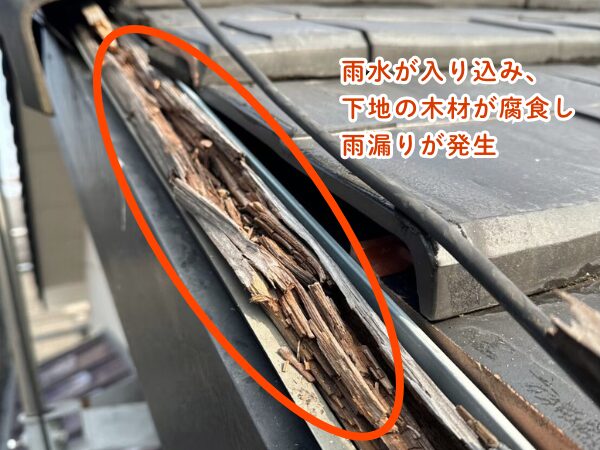 施工不良による隙間から雨水が侵入し、屋根内部の下地木材が腐食している状態でした。