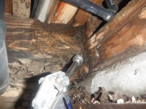 建物は1階がガレージ、2階が浴室という構造。点検してみると、浴室からの水漏れが原因で内部の木材が腐食し、そこにシロアリが入り込んでいたことがわかりました。