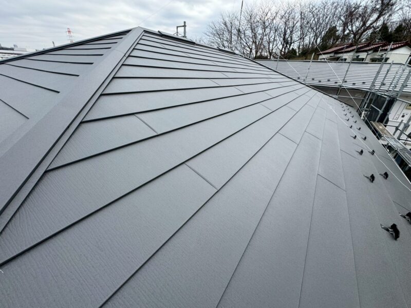 強風や台風の後に雨漏りが始まった場合、屋根の頂上部分を覆っている棟板金(むねばんきん)の浮きや釘の抜けが原因であることがよくあります。棟板金とは、屋根の頂点(棟)に取り付けられた金属製の板のことで、屋根材の端部を保護する役割を果たしています。台風などの強い風にあおられると、この棟板金を固定している釘が少しずつ抜けてきたり、板金自体が浮き上がったりすることがあるのです。