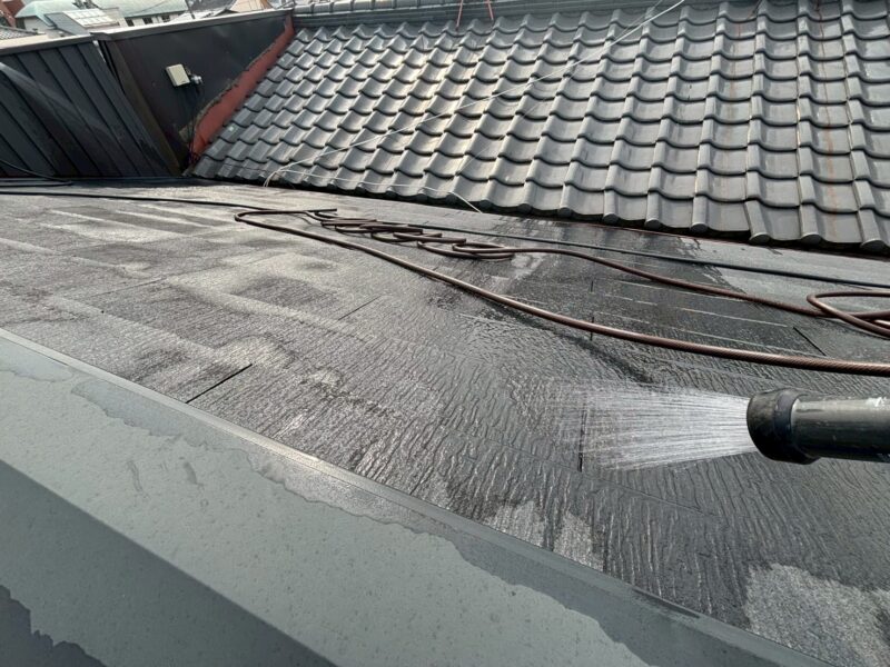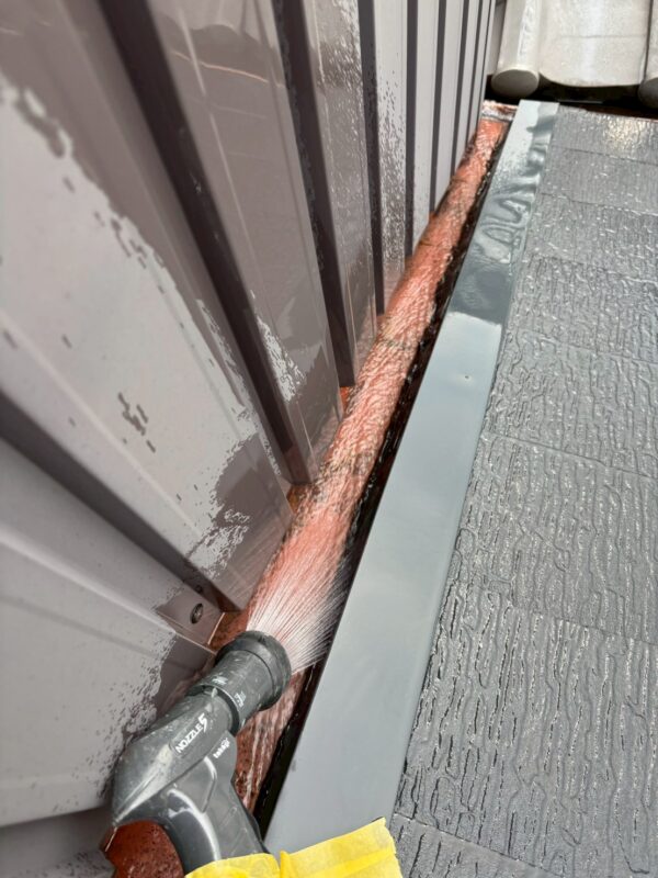 散水調査を行ったところ、屋根と壁が接する取り合い部から雨漏りが発生していることが分かりました。