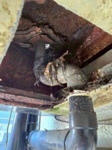 この破損箇所から水が漏れ、天井裏を伝って雨漏りとして現れていました。