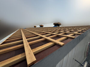 さらに、屋根の下地を確認したところ、下地のピッチ(間隔)が広く、強度的にも不安のある状態でした。昔の建物ではこのように下地の間隔が粗いケースも多く、現在の基準と比べると風に弱い構造となっていることがあります。