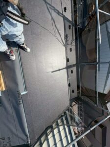 下地に穴あきが見られ、築年数から経年劣化が進行していることから、新しく下地から交換させていただく葺き替え工事をおこなっていきます。