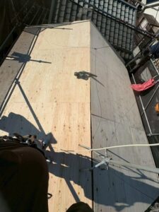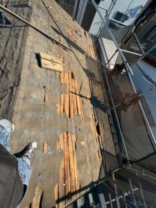 下地に穴あきが見られ、築年数から経年劣化が進行していることから、新しく下地から交換させていただく葺き替え工事をおこなっていきます。
